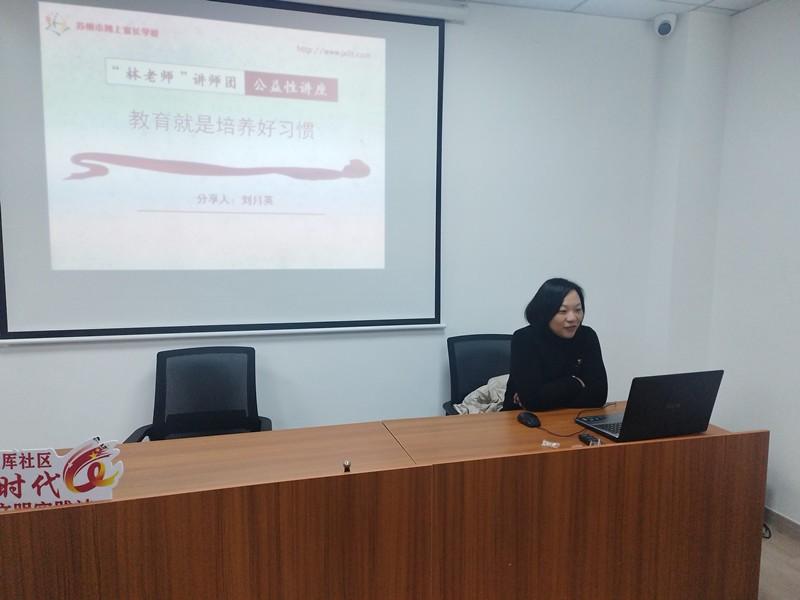 活动中,苏州市中小学高级家庭教育指导师、北厍小学党支部副书记刘月英为家长们开设了专题讲座《教育就是培养好习惯》。讲座深入浅出,围绕“孩子的习惯”展开,用生动的案例分析孩子习惯培养的重要性,总结习惯培养的多个方面,为社区家长提供了科学的家庭教育指导。