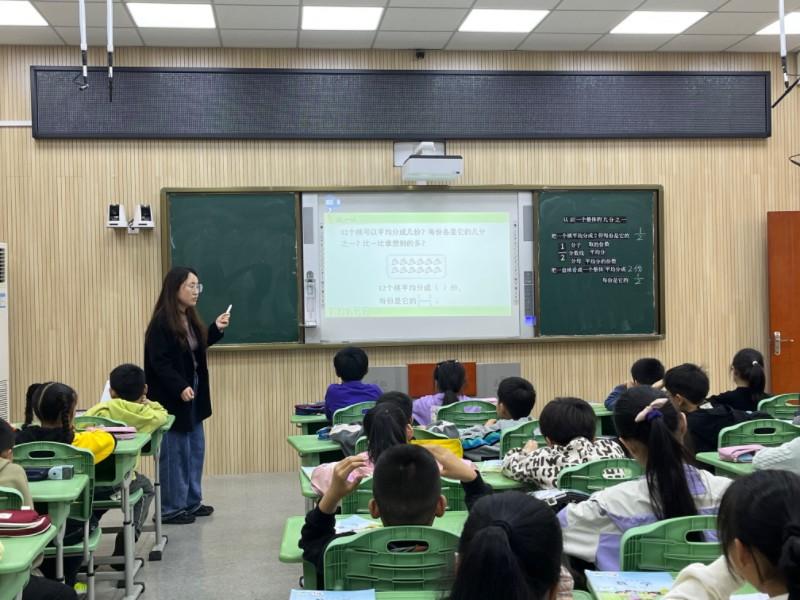 朱熠老师执教三年级下册《认识一个整体的几分之一》,朱老师从学生已有的经验出发,由分一个桃到分一盘桃,感受平均分对象的变化。引导学生借助分一分、涂一涂等操作感受一个整体的二分之一,启发学生利用学习二分之一的方法来认识其他的几分之一,从而完成对一个整体的几分之一的建构。周玉兰老师结合“教—学—评”一体化,畅谈了自己对本节课的思考和建议。随后周老师从单元整体作业设计的结构组织、内容分层和作业指向进行了高效地指导。