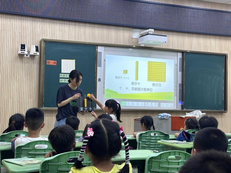活动中,韩楚霏老师执教二年级上册《认识100和计数单位“百”》一课。她紧扣新教材理念,借助小正方体教具,引导学生理解“99添上1是100”“10个十是100”,并通过动手操作、表达交流、对比感知,帮助学生建立100的数感。课后,金校长对韩老师的课堂进行细致点评,既肯定其教学思路,也提出优化建议;同时围绕“单元整体作业设计”展开专题讲解,为教师提供实践方向。
